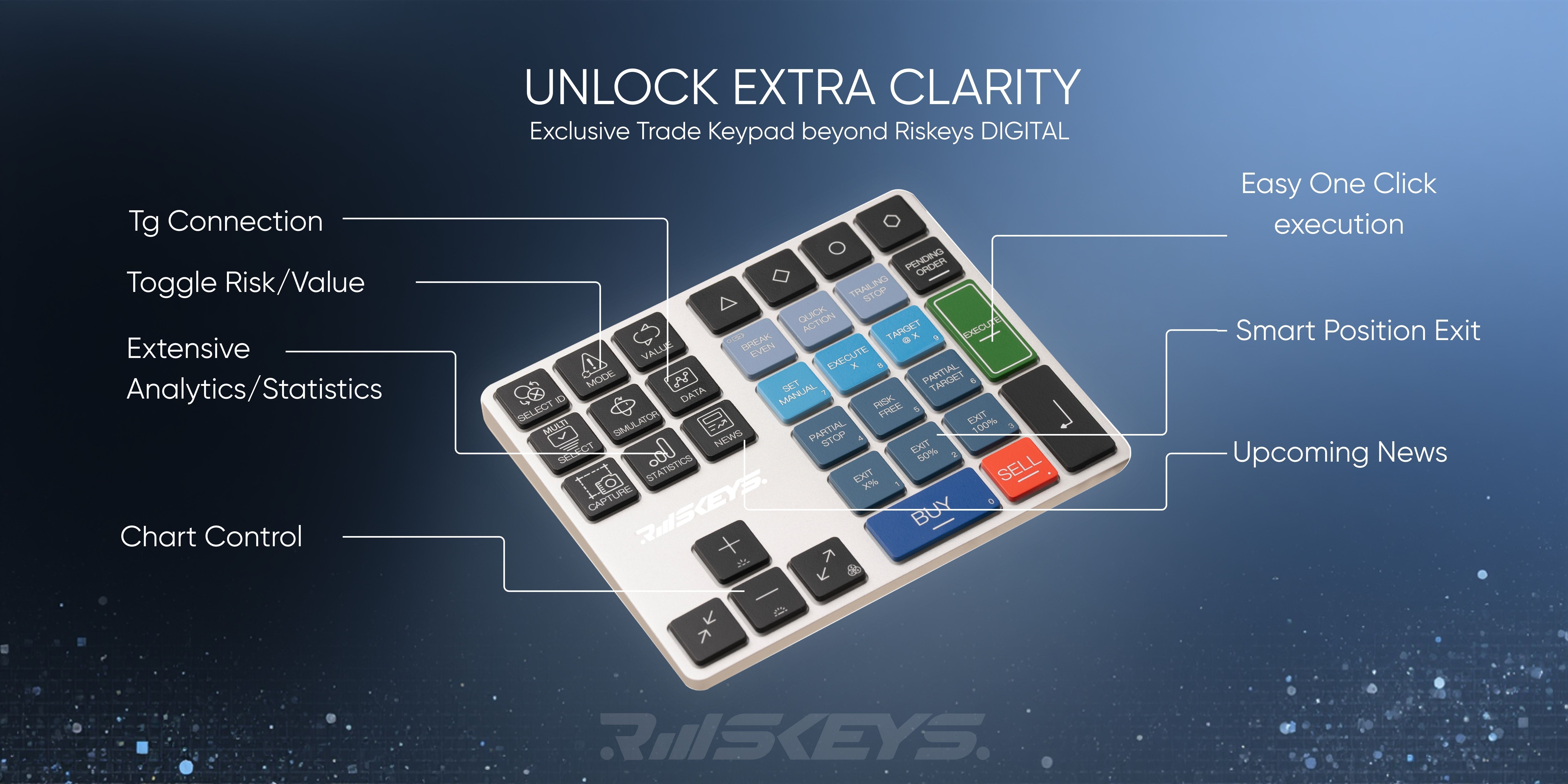 Riskeys is a smart trading keypad designed to simplify trading, improve risk management, and streamline calculations with a built‑in lot‑size and position‑size calculator. It helps traders execute strategies efficiently, making trading less stressful and more effective.
